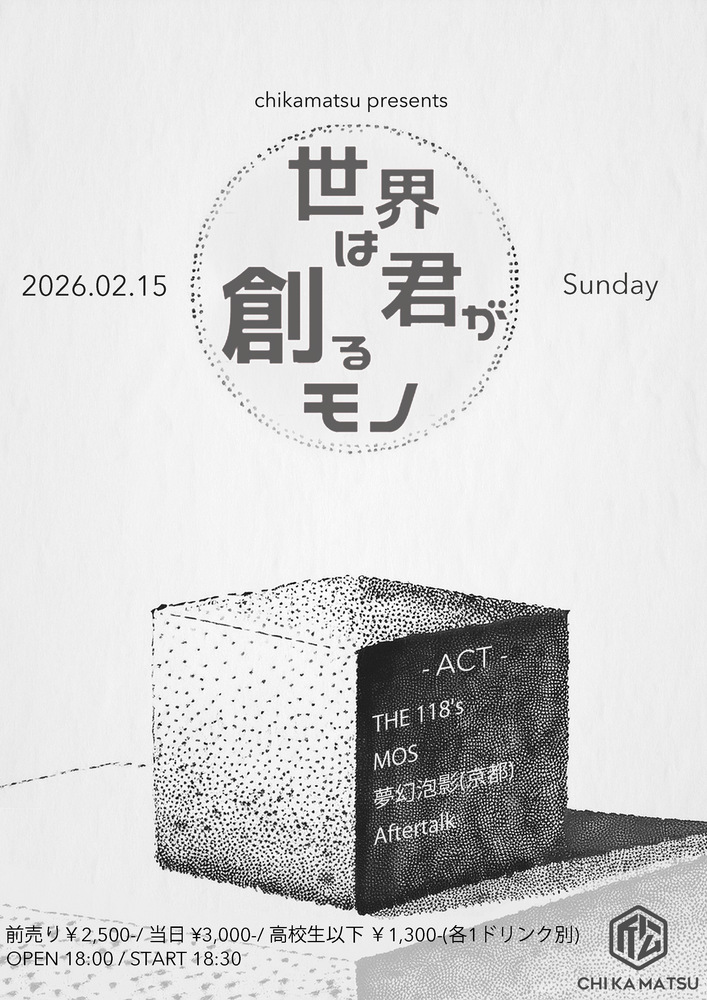 下北沢 近松 pre. 「世界は君が創るモノ」 LIVE SCHEDULE 2026/02/15(日) 東京 下北沢 近松 地図を表示 open 18:00 / start 18:30 adv ¥2500 / door ¥3000 / 高校生以下 ¥1300 各1ドリンク代 ¥700 別途必要 act/ THE 118's MOS 夢幻泡影(京都) Aftertalk THE 118's 出演時間:21時05分〜 チケットご予約 URLをコピーする 報告する